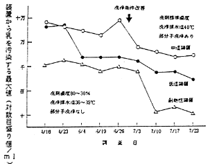 | 耐熱性細菌 | 28(43〜20未満) | 41(230〜17) | 11(19〜10未満) | 10未満 | 360(670〜130) | 89(140〜80未満) | |