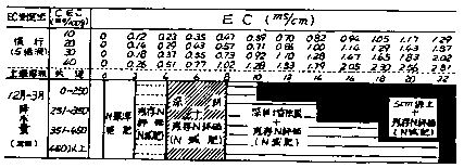 9)以上の結果を総括表(土壌EC値と越冬期間の降水量を考慮したハウスの管理目標)としてとりまとめた。