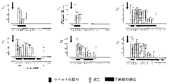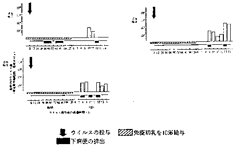 図2 牛ロタウイルス1型攻撃後の経時的な臨床像ならびに糞便中のウイルス量(免疫初乳群)