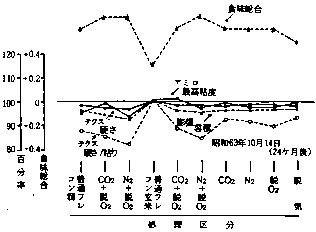 3)酸素濃度を制御した各種貯蔵の効果は低温貯蔵、籾貯蔵よりも小さく、良い方から窒素ガス+脱酸素剤>炭酸ガス+脱酸素剤>脱酸素剤>窒素ガス>炭酸ガス>脱気>普通フレコンの順となっていた。(図1)