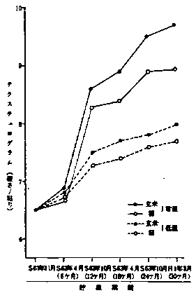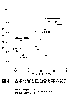 5)貯蔵中における古米化の進行程度は蛋白含有率と関係していることが認められた。したがって、貯蔵からみても低蛋白米の生産が必要と考えられる。(図4)