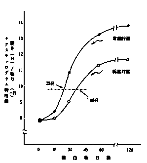 6)白米の貯蔵中における食味特性の低下は玄米、籾よりもはるかに大きく、これに対しても低温での貯蔵が有効であった。白米の食味は常温で25日、低温で40日ほど維持されることを認めた。(図5)