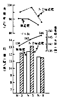 N施肥量3段(①3、②5、③8㎏/10a)×N追肥量(①無追肥、②N2㎏/10a追肥)2×3=6区、P2O515Kg/10a共通、追肥月日、6月5日