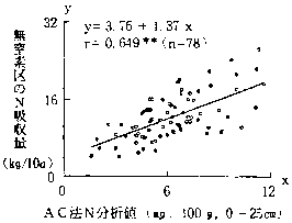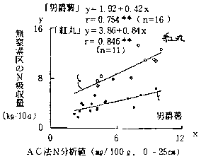 5)無窒素区のN吸収量とAC法N分析値との回帰式(図1,2)ならびにN用量試験から求めた目標N吸収量及びみかけのN利用率からN施肥量の予測式を求めた(第1表)。