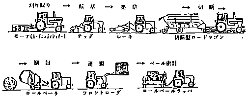 | 図1 カッティング・ロールベールサイレージ調製のための作業体系 |