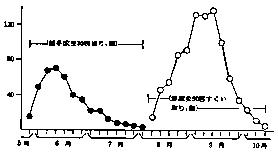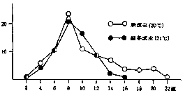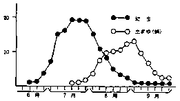 7.幼虫の初発は6月中旬末から下旬半ばで、ピークは7月中旬から下旬初めに見られた。また、土まゆ(蛹)は7月中旬から下旬にかけて見られ、8月中、下旬にピークを示した。