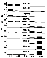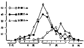 5.水田に侵入した越冬成虫は畦畔沿いの稲株に集中的に寄生加害し、水田中央部への拡大は少ない。また、水田の四角など均平化不備の深水稲株にも多く集まり、発生のピークは6月10〜15日で、7月下旬まで稲株上に生息、加害する。新成虫は8月上、中旬から10月中旬に認められた。