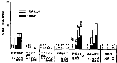 2)薬剤による消毒効果確認:中性次亜塩素酸カルシウム剤で処理したデカンター排液を散布、混入した殺菌土壌に馬鈴しょを栽培し、新塊茎における発病の有無によって判定した。