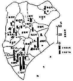 1)十勝支庁管内ではインゲン黄化病の被害は全般に周辺部で高く、中央部で低かった。(図1)
