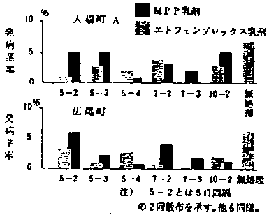 2)その場合の防除体系としてピレスロイド様殺虫剤ては7日間隔3回散布の散布体系が最も安定して防除効果が高まった。また、MPP乳剤でも7日間3回散布の体系が有効と考えられた。(図10)