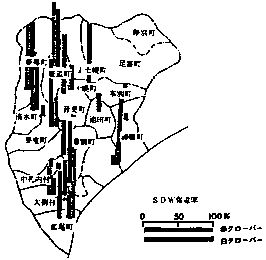 5)ELISA法による調査で、十勝支庁管内の牧草地のシロクローパーのSDV保毒率は全般に高く、とくに周辺部で非常に高かった。アカクロ一バーも同程度のウイルス保毒率であった。