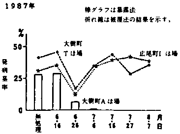 図3 寒冷紗の被覆、暴露法による黄化病発病率の時期による違い