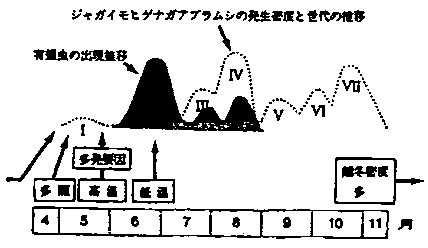 8)黄化病の病原ウイルスに感染するのはほぼ6月中旬から7月はじめの期間に集中し、これはジャガイモヒゲナガアブラムシの第2世代の有翅虫の飛来が原因であった。また感染の一部が7月下句に起こるが、これは第3世代の有翅虫の飛来が原因であった。(図3)