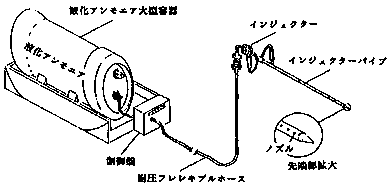 低下し、アンモニアが完全に気化するのに(常温に戻るのに)、冬場では5-14日、夏場でも遅い例では5日間かかり、下部の反応が最も遅れた。これらのデータに基づいてインジェクターのノズル形状を改良させ、ベールヘの注入位置については乾燥材科ではべール中心部よりも上部に、水分が多い材料では中心部よりも下部に注入することによって均一処理が可能になった。