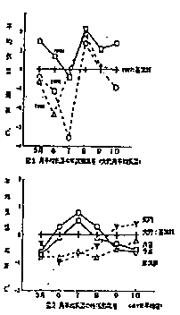 1)生育初期(6月)、中期(出穂前30日間)の気温が低温〜ヤヤ低温であったのは1988年、'89年及び知内、八雲であった。また初期、中期が高温〜ヤヤ高温であったのは'87年、'90年及び厚沢部、大野、今金であった。これに後期(出穂後40日間)の気温を組合せ、さらに、幼形期等の生育進度を対応させて、気象経過のパターンを6類型に分けた。(図1、図2、表1)