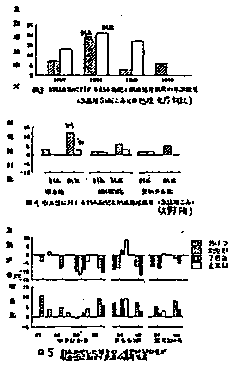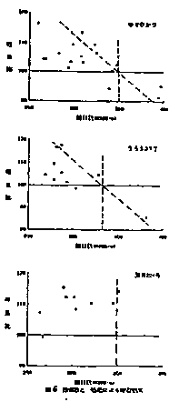 3)測条施肥の初期茎数の増加に対する効果は、いずれの年次も認められたが、初期低温年('89)にはさほど高くなかった。穂数、総籾数はわずかに増加することもあるが、ほとんどの場合、全層施肥と大差がない。登熟歩合向上と収量性に対する効果は認められた。(図3、図4)