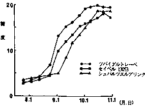 (2)果実中の主要な有機酸は酒石酸とリンゴ酸であり、酒石酸は収穫期まで減少を続け、リンゴ酸はペレーゾン期以後、増加から減少に転じた。リンゴ酸の減少が大きいため、成熟につれて酒石酸/リンゴ酸化(T/M比)は増加した。収穫期のT/M比は早生品種シーガーレーぺ、オプティマは1.0以上、晩生品種のリースリングは1.0以下と、品種差が認められた。