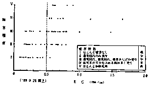 2)EC値とナトリウム、塩素含量とは高い相関関係がみられることから、海水かんがいの程度を簡易にEC値で診断した。その結果、被害田の塩類濃度は障害程度に応じ高まり、EC値の0.5ms/㎝以上で障害程度が大きかったので被害田対策の一応の目安になると考えられた。(図2)