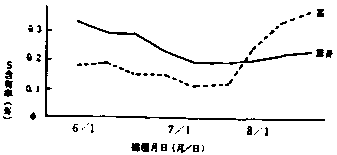 (3)播種時期の違いによるソバのS含有率の変化は、生育量が十分確保された6月上旬〜7月中旬までに播種したものが安定したS含有率を示した。(図-2)