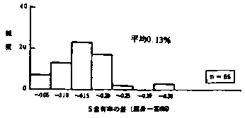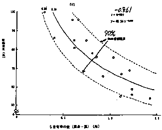 (5)SO2接触にともなう生育(乾物重)抑制と、S含有率(葉身S−茎S)との関係より、生育抑制値は0.39%(信頼限界90%幅0.28〜0.61%)以上であった。(図-4)