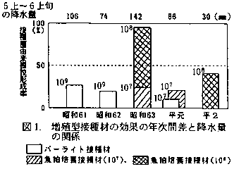 ③十勝農試圃場における結果によると、パーライト接種材を用いた土壌接種では、接種菌数109(1株当り)レベルで、20〜30%の接種菌由来根粒形成率を得るにすぎなかったが、魚粕培養接種材では、108レベルでも40〜90%の根粒を接種菌に置き換えることができた(図1)。