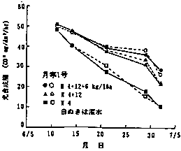 7)後期重点窒素施肥は、作土層の根量を増加させる効果もあるが、登熟期の根活性を顕著に高める効果がある。ルビジュウム土壌注入法で測定した地面当りの根活性と止葉の光合成能および子実収量の間にきわめて高い相関が認められた。