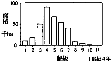 1)民有林のカラマツ人工林は345,000ha(全体の約70%)を占め、間伐が必要な3〜6齢級が75%に達している。農用トラクタが集材作業に利用できる適地は道東地方に広く分布している。