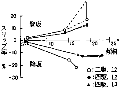 2)トラクタ単体による林内走行限界は二輪駆動で傾斜15度前後、四輪駆動では傾斜22度