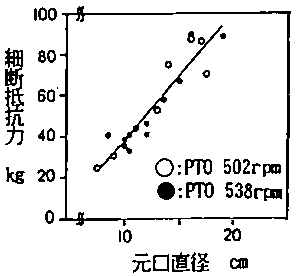 6)チッパの細断所要動力は、供給材の元口径が12cmの時30.1psであった。連続供給できる材の元口径は12cmが限界であるが、負荷の状況に応じて間欠供給操作をすれば径12cm以上の材の細断も可能である。適用トラクタは50〜70ps級である。