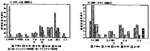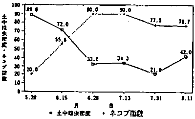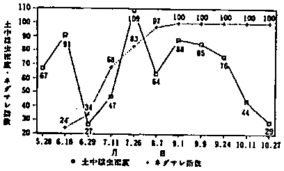c.ゴボウ圃場において土壌深度別のキタネグサレセンチュウ密度の推移をトレンチャー耕起との関連で調べたが、トレンチャー耕起前の密度は前作がゴボウの場合には深さ80cmまで、小豆のように根の浅い場合には地表下20cmまでに高いが、トレンチャー耕起後には土壌が混和され耕起の深さまで分布するようになる。線虫密度は6〜7月には根への侵入により低下し、8月頃から根から離脱した線虫により高まる(図3)。