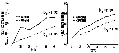 (5)選抜指数値の世代平均値は、1世代あたり雄で2.32ポイント、雌で2.28ポイント増加し(世代に対する世代平均値の回帰から求めた値、bR)、理論的に期待された世代あたりの増加重(bE)雄1.85ポイント、雌1.91ポイントを上回った(図2)。