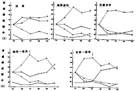 草地利用法、即ち採草、輪換放牧、定置放牧の各利用法と草地の植生の変化の関係を明確にする。