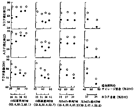 図1 サイレージ中繊維成分の性質と、給与水準別混合飼料の消化率ならびにTDN含量との関係