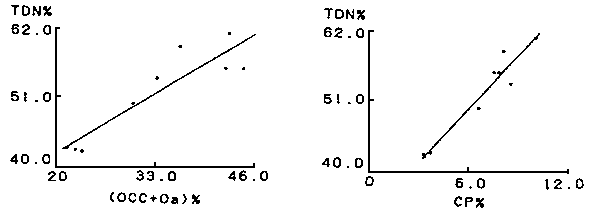 TDN含量推定に供試した麦稈のTDN含量は最低が42.2%、最高が61.2%の範囲に分析しており代表的な試料を見なされた。TDN含量と成分含量との間の回帰式、相関係数、回帰推定の標準誤差をみると、OCC+OaおよびCPからの一次式が標準誤差が小さく最も優れていた。ADF,NDFはTDN含量との相関係数が低く、標準誤差も大きかった。