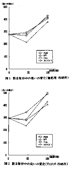 粉末の臭いは室温明所よリ冷暗所に保存したほうが強い。保存中明度は室温明所では増大し、冷暗所では減少する。緑色は保存中に弱まるがアルミラミネートフィルムでは保持される。アルミラミネートフィルムに密封包装し、冷所(3℃)で保存すると3ヵ月は品質保持できる。