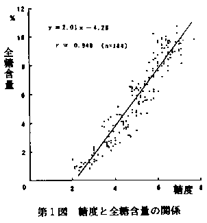 果肉から直接に搾汁し測定した糖痩は、測定値のバラツキが大きく、果肉中の全糖含量よリかなリ高い値を示した。測定値の安定性、搾汁のし易さ、全糖含量の値に糖度が近い値を示す点から、剥皮した赤道部の果肉に同量の水を加え磨砕し、上澄液による糖度測定が適当であった。この方法によって得られた糖度と全糖含量との間に相関係数r=0.948(n=184)、回帰直線y=2.01×-4.26(y:全糖、X:糖度)が得られ、高い相関関係を認めた。
