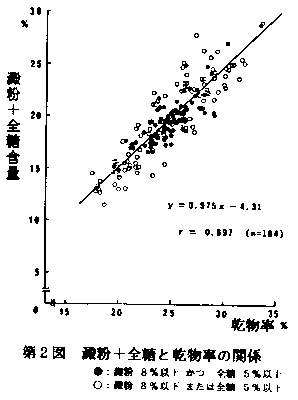 果実の赤道部の果肉(30〜40g程度)を厚さ3〜5mmのスライス状に4〜6枚に切断し、60〜80℃で一昼夜乾繰して、乾物率を得た。乾物率と澱粉に全糖含量を加えた値との間に相関係数r=0.897(n=184)、回帰直線y=0.975×-4.31(y:澱粉+全糖、X:乾物率)が得られ、高い相関関係を認めた。