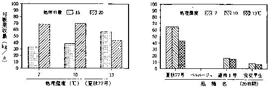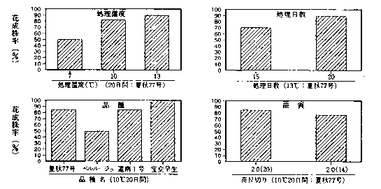 2)品種としては“夏秋77号”が花成効果が安定しており暗黒低温処理に適していると考えられた(第2、3図)。
