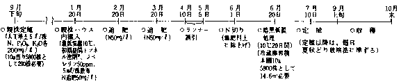 量は箱植えする場合、N、P2O5、K2O各培地1L当り200mg(1000mg/株)、N施肥量は採苗年の親株加温開