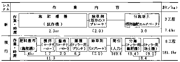 まず,施肥播種同時作業の試作機を開発した。そして,これと除草および分施培土作業を組み合わせた各種圃場試験を北農試内および現地で行った。