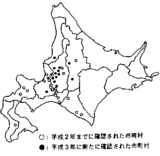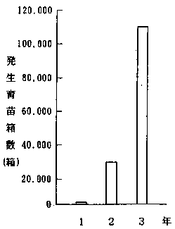 Psedomonas plantarii Azegami et alによる苗立枯細菌病であることが明らかとなった。(2)平成3年には発生分布が拡大し、7支庁25市町村で発生が認められ、発生育苗箱数は109,670箱にのぼった(図2)。これで、本病の発生が認められたのは8支庁35市町村となった(図1)。