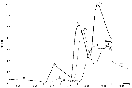 2)年聞の発生世代数は2回と3回の混合であり,この比率は年次によって大きく異なる。