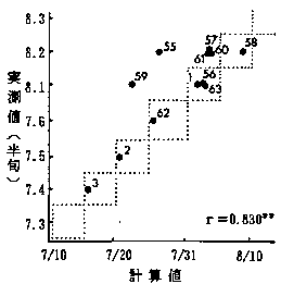 旭川における第1世代および第2世代成虫発生最盛期の的中率は,半旬単位で62%,1半旬異なったものも含めると的中率は85%であった。