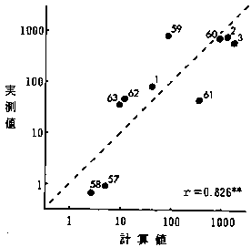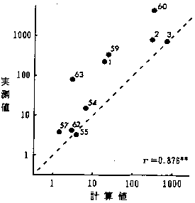 旭川について,実際の春期越冬幼虫数を初期値としてモデルで第2世代成虫数および秋期越冬幼虫数を計算すると,計算値と実測値との相関はr=0.876**およびr=0.826**であり,一律の変化率を乗じた場合より適合性が高かった。