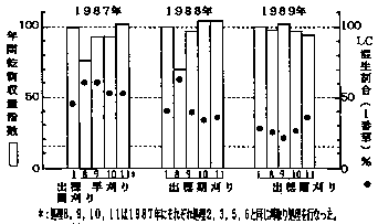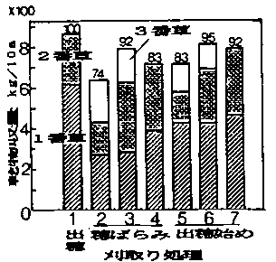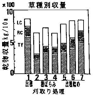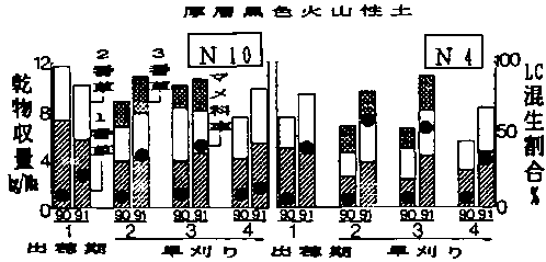 7.未熟火山性士および厚層黒色火山性土において、植生区分3の草地を早刈りした場合の収量および草種構成の変化は、場内(黒色火山性土)における植生区分4の草地の場合と同様であった。また、早刈りがLCの回復に有効であることが指摘された(図5)。