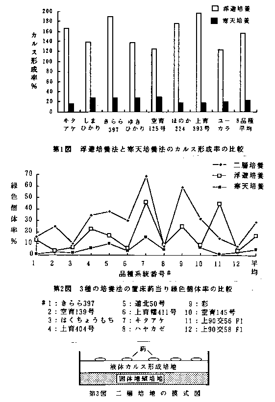 (1)葯を液体のカルス形成培地に浮遊培養することによって寒天培養に比べてカルス形成率を5〜10倍に高
