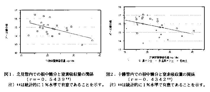 (1)窒素吸収量の増大が低糖分を招く原因であり、糖分向上にとって土壌窒素診断による窒素施肥量の適正