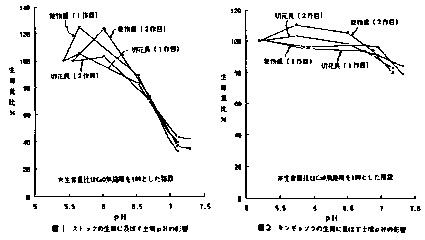 1)土壌pH試験(平3):①ポット試験;土壌pH5水準(5.0〜7.5)