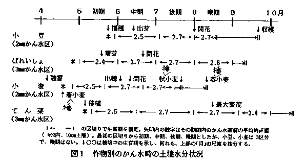 | 処 理 | : | 少かん水区:1mm/日(途中の一定期間、多量かん水) | ┓ | ※左記基準で間断日数を 7日とし、作物により若干の 参考処理を併置した。 |