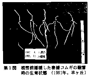 1)根雪前播種された春播コムギは積雪下で発芽し、数本発生した種子根は越冬中にも伸長し続け、融雪時